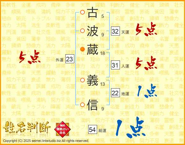 古(5画)波(9画)蔵(18画) 義(13画)信(9画)