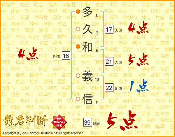 多(6画)久(3画)和(8画) 義(13画)信(9画)