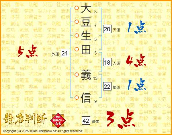 大(3画)豆(7画)生(5画)田(5画) 義(13画)信(9画)