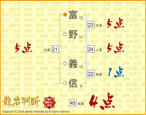 あなたの人生を表す1番重要な運勢です。生涯を通じて影響する総合運となり、主に50歳以降の晩年期に影響を及ぼします。苗字と名前の合計画数。