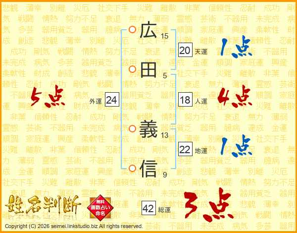 生活面を象徴する運勢です。外部から受ける影響力を表し、結婚運、家庭運や職場、環境への順応性を表します。総運から人運を引いた画数。姓や名が1文字の場合を除く。