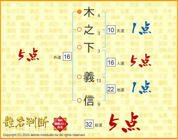 木(4画)之(3画)下(3画) 義(13画)信(9画)