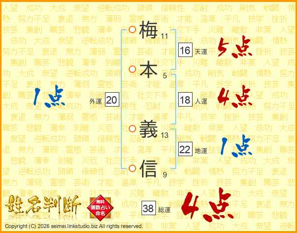 梅(11画)本(5画) 義(13画)信(9画)
