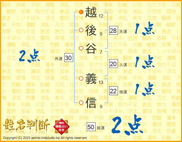 越(12画)後(9画)谷(7画) 義(13画)信(9画)