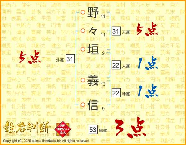 野(11画)々(11画)垣(9画) 義(13画)信(9画)