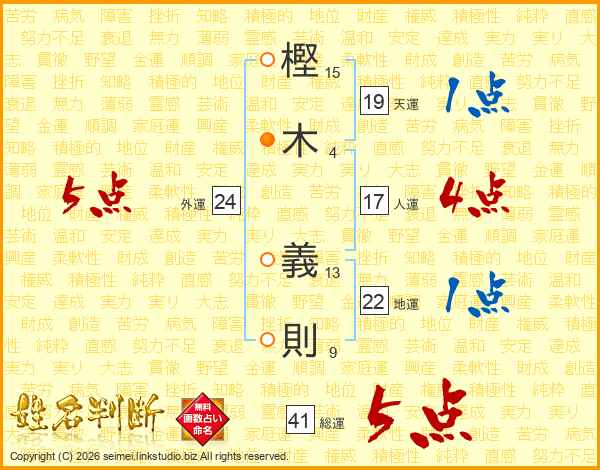 樫(15画)木(4画) 義(13画)則(9画)