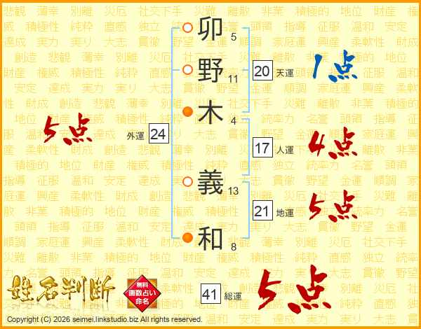 卯(5画)野(11画)木(4画) 義(13画)和(8画)