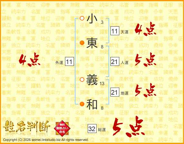 生活面を象徴する運勢です。外部から受ける影響力を表し、結婚運、家庭運や職場、環境への順応性を表します。総運から人運を引いた画数。姓や名が1文字の場合を除く。
