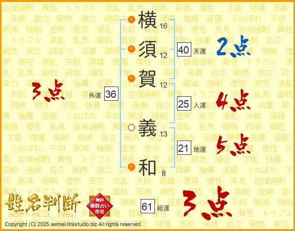 横(16画)須(12画)賀(12画) 義(13画)和(8画)