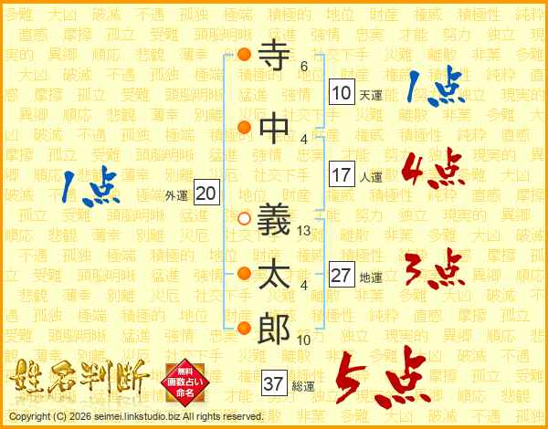 寺(6画)中(4画) 義(13画)太(4画)郎(10画)