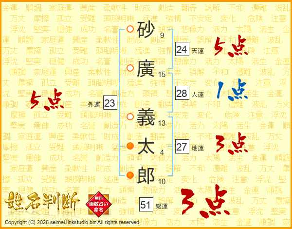 砂廣義太郎さんの総運は51画の3点!