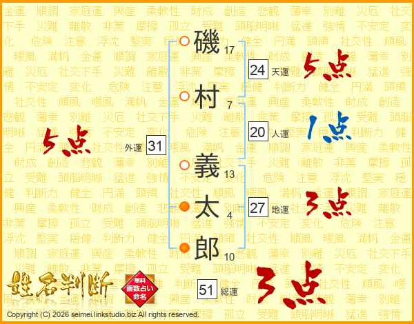 磯(17画)村(7画) 義(13画)太(4画)郎(10画)