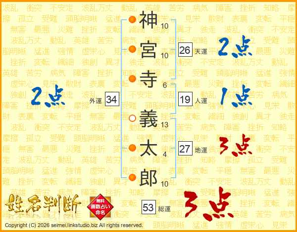神(10画)宮(10画)寺(6画) 義(13画)太(4画)郎(10画)