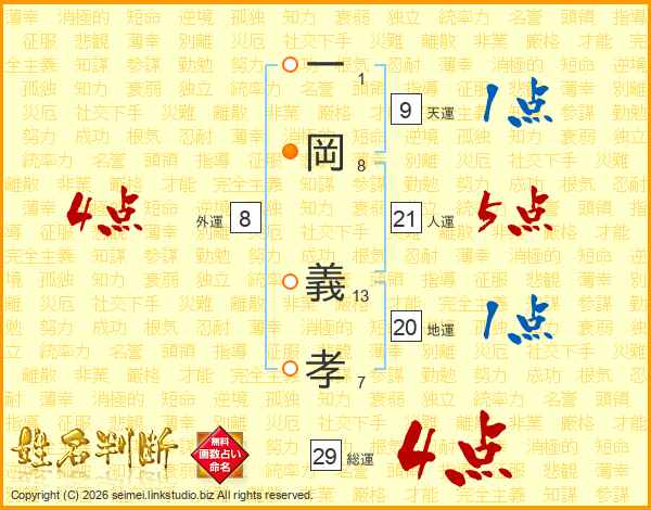あなたの人生を表す1番重要な運勢です。生涯を通じて影響する総合運となり、主に50歳以降の晩年期に影響を及ぼします。苗字と名前の合計画数。