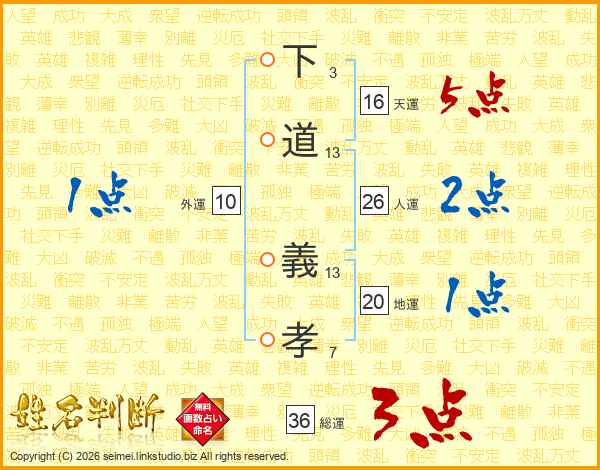 あなたの人生を表す1番重要な運勢です。生涯を通じて影響する総合運となり、主に50歳以降の晩年期に影響を及ぼします。苗字と名前の合計画数。