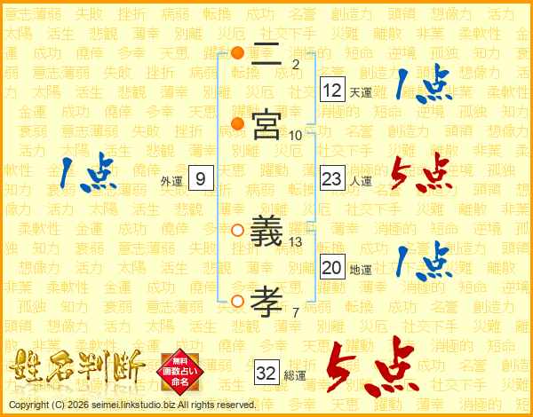 生活面を象徴する運勢です。外部から受ける影響力を表し、結婚運、家庭運や職場、環境への順応性を表します。総運から人運を引いた画数。姓や名が1文字の場合を除く。