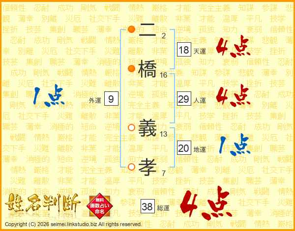 家系が持つ宿命的な運勢を表します。祖先から受け継いだ苗字ですので自分の力が及びません。家柄を象徴します。苗字の合計画数。