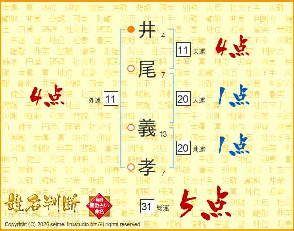画数の奇数(○陽)と偶数(●陰)の配列で吉凶を占います。どちらかにかたよる名前は大凶名で避ける必要があります。画数の奇数偶数。