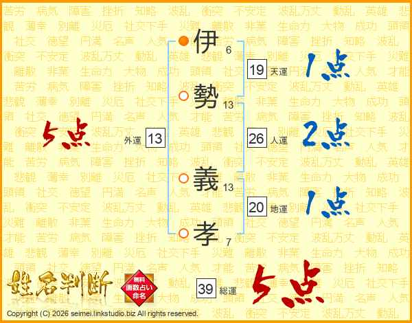 伊(6画)勢(13画) 義(13画)孝(7画)