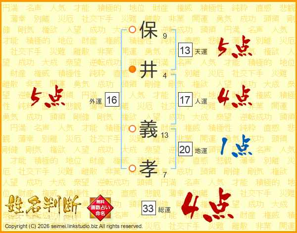 保(9画)井(4画) 義(13画)孝(7画)
