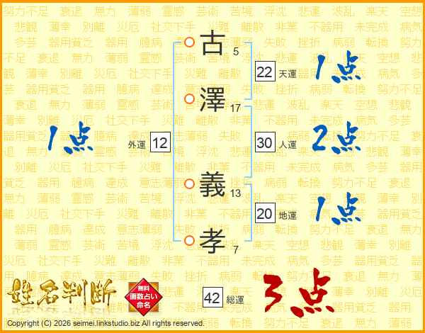画数の奇数(○陽)と偶数(●陰)の配列で吉凶を占います。どちらかにかたよる名前は大凶名で避ける必要があります。画数の奇数偶数。