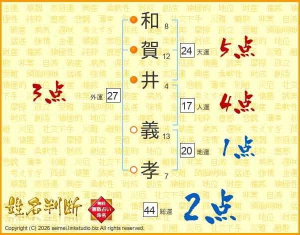 和(8画)賀(12画)井(4画) 義(13画)孝(7画)
