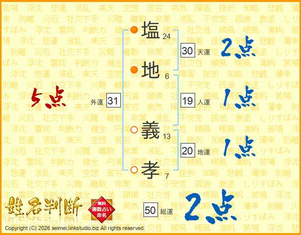 塩(24画)地(6画) 義(13画)孝(7画)