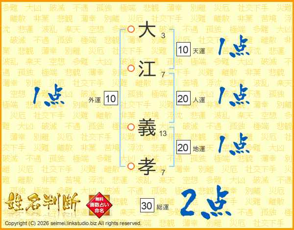大(3画)江(7画) 義(13画)孝(7画)