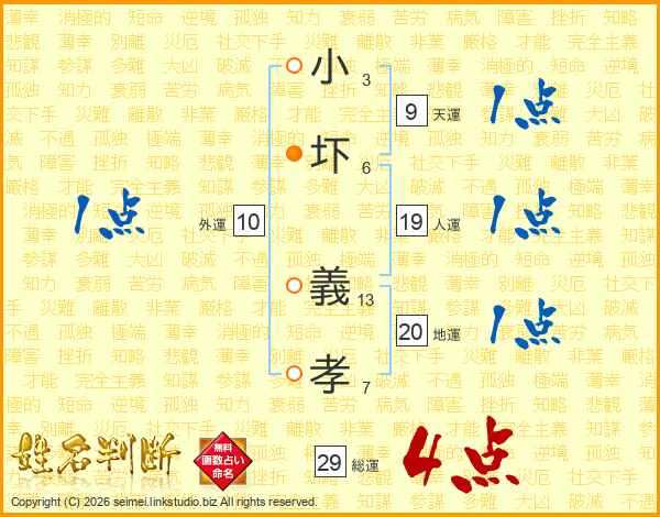 画数の奇数(○陽)と偶数(●陰)の配列で吉凶を占います。どちらかにかたよる名前は大凶名で避ける必要があります。画数の奇数偶数。