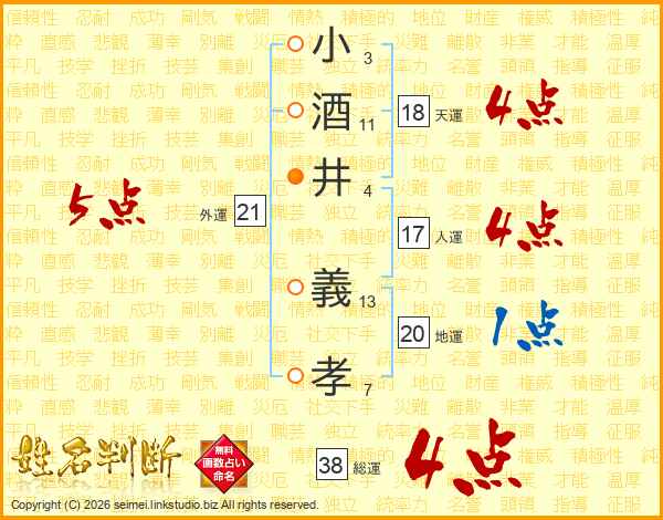 小(3画)酒(11画)井(4画) 義(13画)孝(7画)