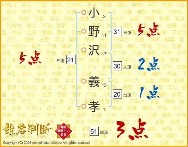 小(3画)野(11画)沢(17画) 義(13画)孝(7画)