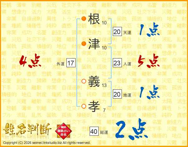 あなたの人生を表す1番重要な運勢です。生涯を通じて影響する総合運となり、主に50歳以降の晩年期に影響を及ぼします。苗字と名前の合計画数。