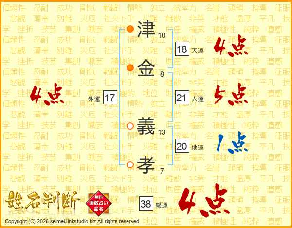 津(10画)金(8画) 義(13画)孝(7画)