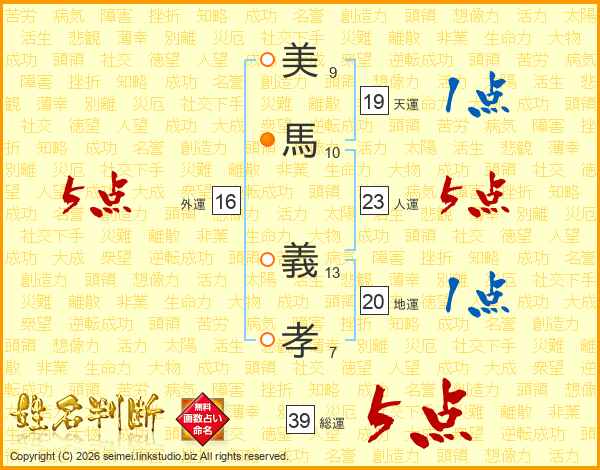 美(9画)馬(10画) 義(13画)孝(7画)