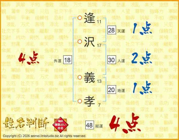 逢(11画)沢(17画) 義(13画)孝(7画)