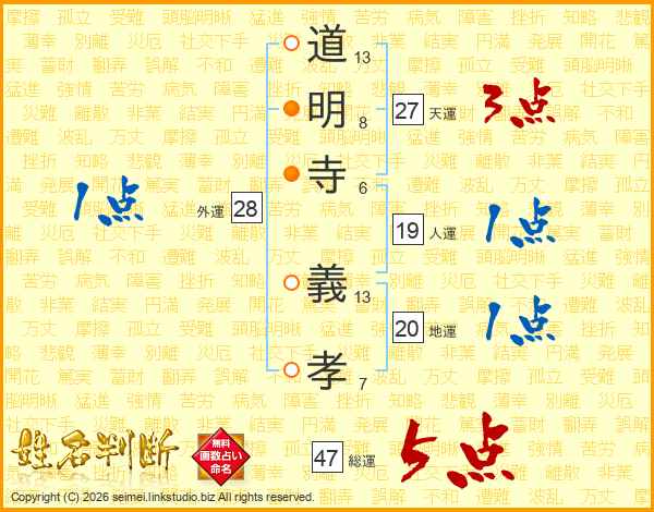 道(13画)明(8画)寺(6画) 義(13画)孝(7画)