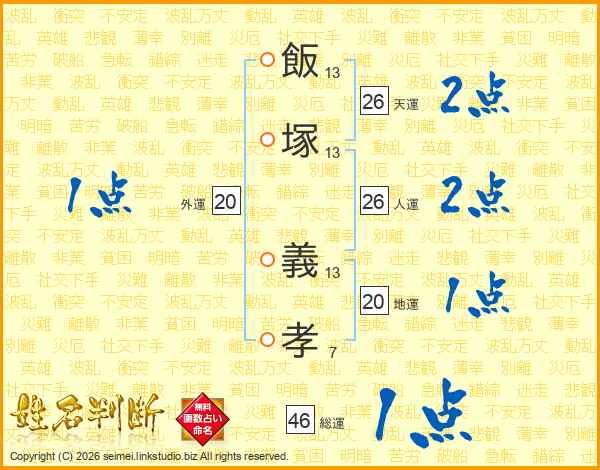 飯(13画)塚(13画) 義(13画)孝(7画)