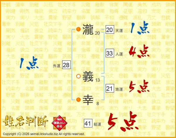 生活面を象徴する運勢です。外部から受ける影響力を表し、結婚運、家庭運や職場、環境への順応性を表します。総運から人運を引いた画数。姓や名が1文字の場合を除く。