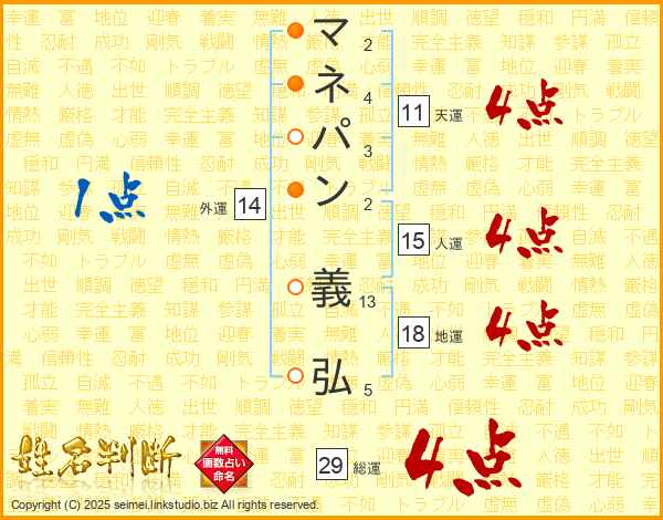 マ(2画)ネ(4画)パ(3画)ン(2画) 義(13画)弘(5画)