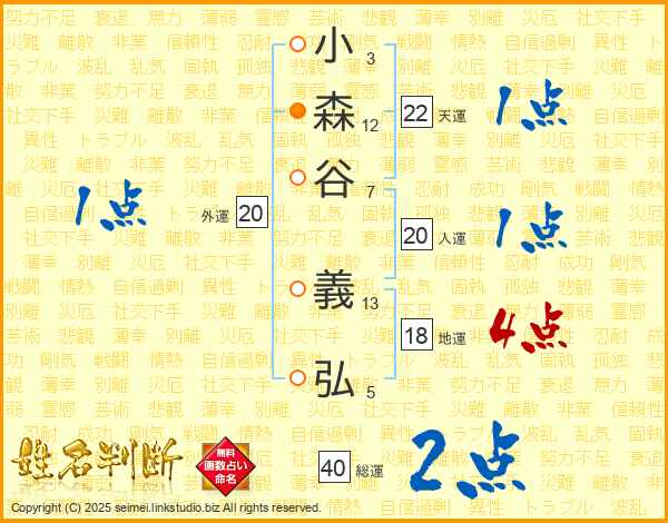 小(3画)森(12画)谷(7画) 義(13画)弘(5画)