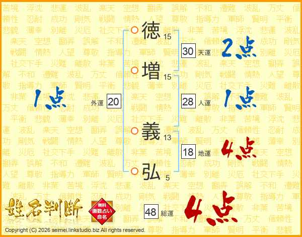 徳(15画)増(15画) 義(13画)弘(5画)