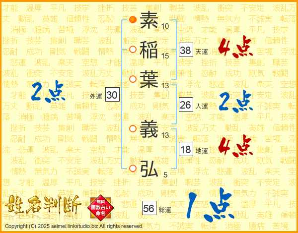 素(10画)稲(15画)葉(13画) 義(13画)弘(5画)