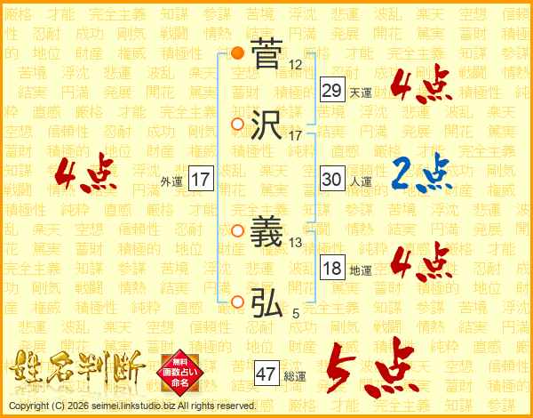 菅(12画)沢(17画) 義(13画)弘(5画)