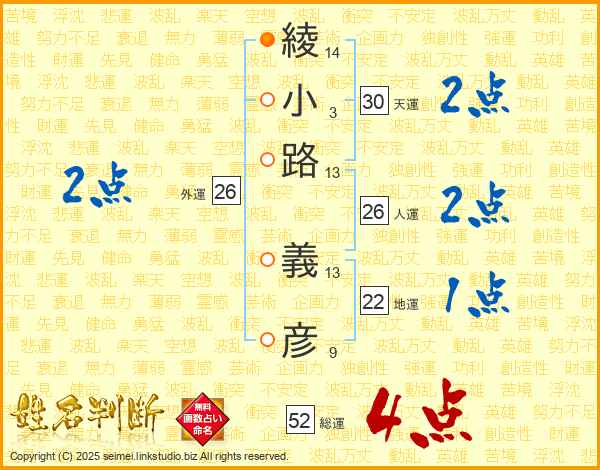 綾(14画)小(3画)路(13画) 義(13画)彦(9画)