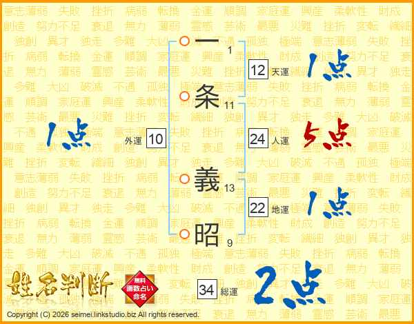 画数の奇数(○陽)と偶数(●陰)の配列で吉凶を占います。どちらかにかたよる名前は大凶名で避ける必要があります。画数の奇数偶数。