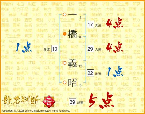 あなたの人生を表す1番重要な運勢です。生涯を通じて影響する総合運となり、主に50歳以降の晩年期に影響を及ぼします。苗字と名前の合計画数。
