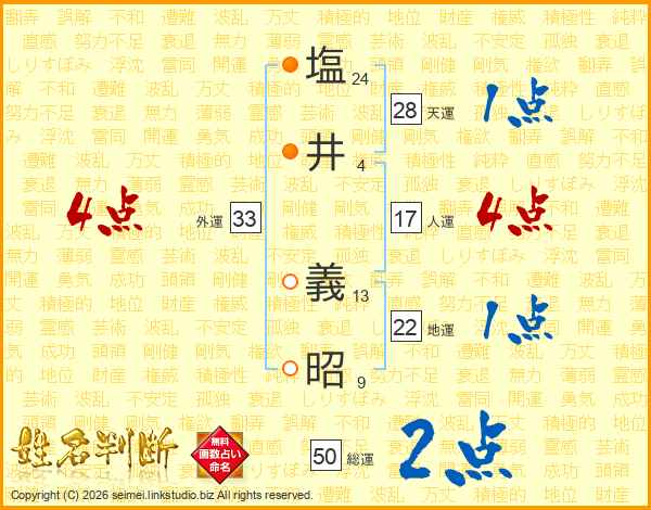 塩(24画)井(4画) 義(13画)昭(9画)