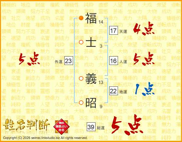 生活面を象徴する運勢です。外部から受ける影響力を表し、結婚運、家庭運や職場、環境への順応性を表します。総運から人運を引いた画数。姓や名が1文字の場合を除く。