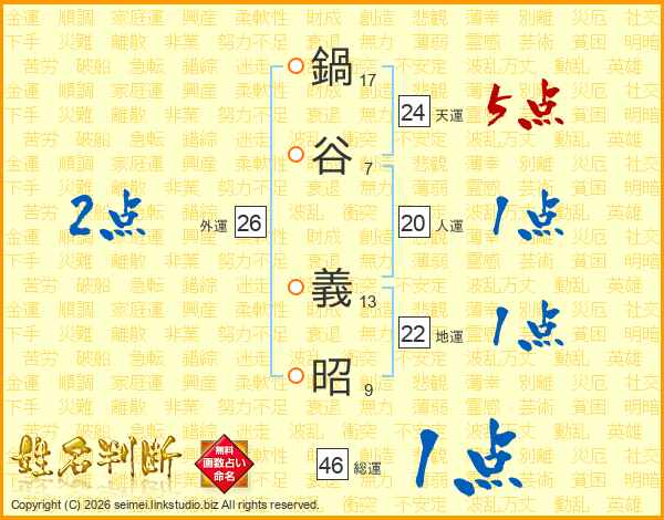 鍋谷義昭さんの総運は46画の1点!