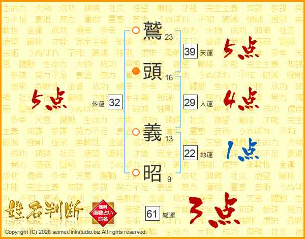 鷲(23画)頭(16画) 義(13画)昭(9画)